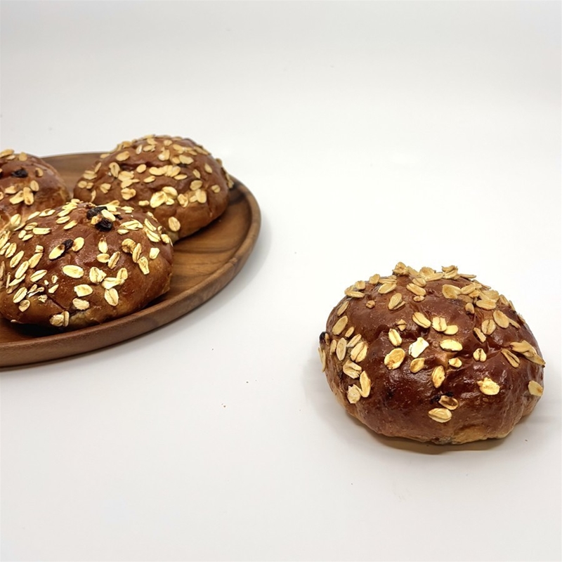 Een zachte bol op basis van tarwebloem gevuld met rozijnen.