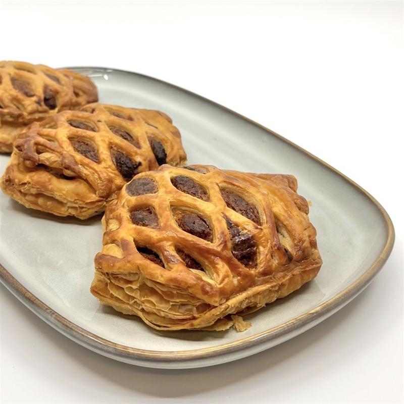 Een belgisch koffiebroodje gemaakt van bladerdeeg. Gevuld met rozijnen en bovenop fondant.