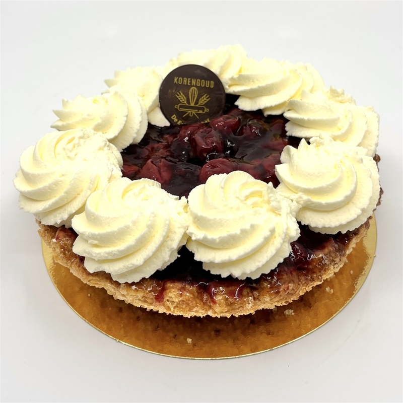 Een krokante schelpbodem met abrikoos, room en slagroom.