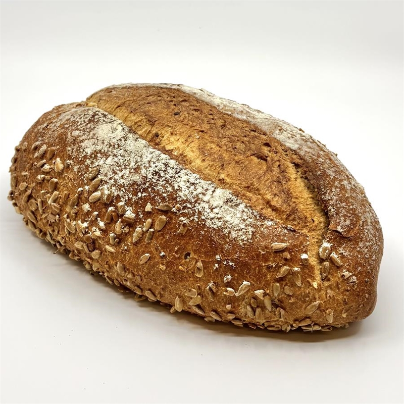 Een bruin brood op basis van tarwemeel en tarwebloem. Gebakken op zonnebloempitjes. heerlijk om zelf aan te snijden.