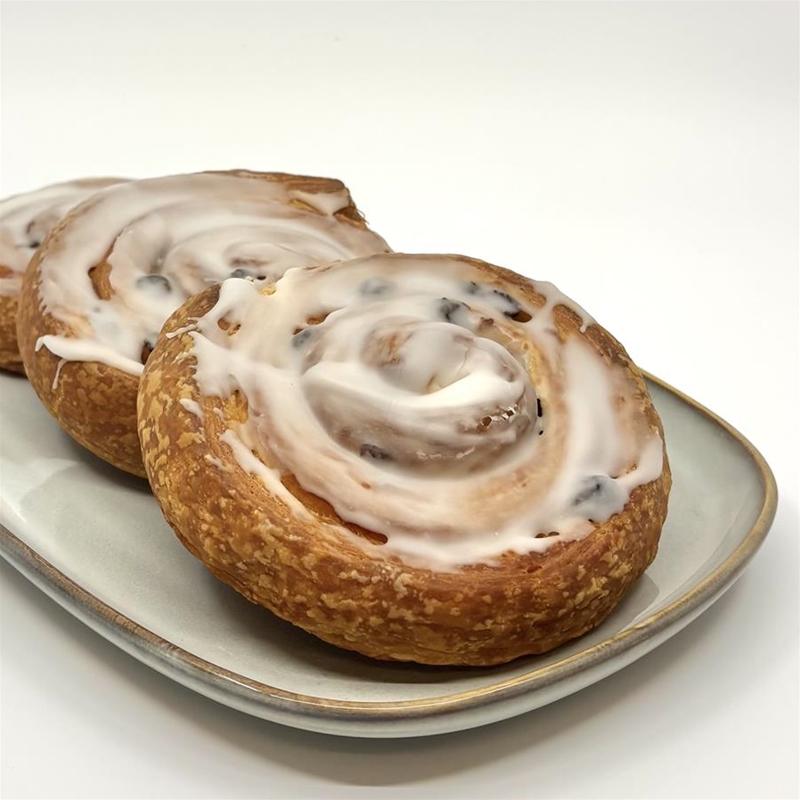 Een belgisch koffiebroodje gemaakt van bladerdeeg. Gevuld met rozijnen en bovenop fondant.