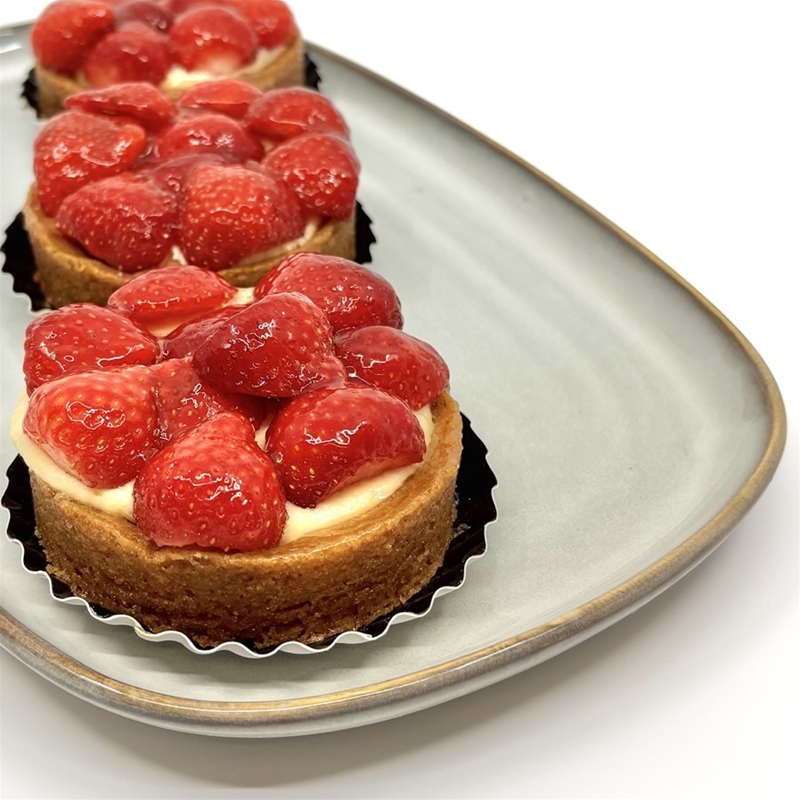 Een sloffenbodem met amandelspijs, Zwitserse room en aardbeien.