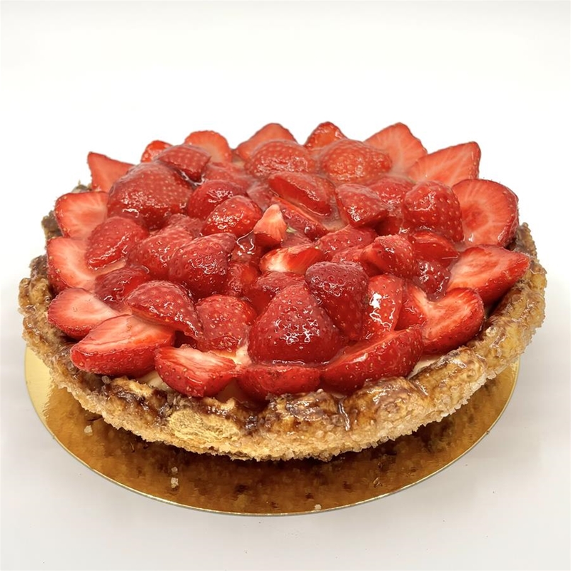 Onze 6 persoons aardbeienvlaai met Zwitsere room en verse aardbeien. Kies je eigen bodem.