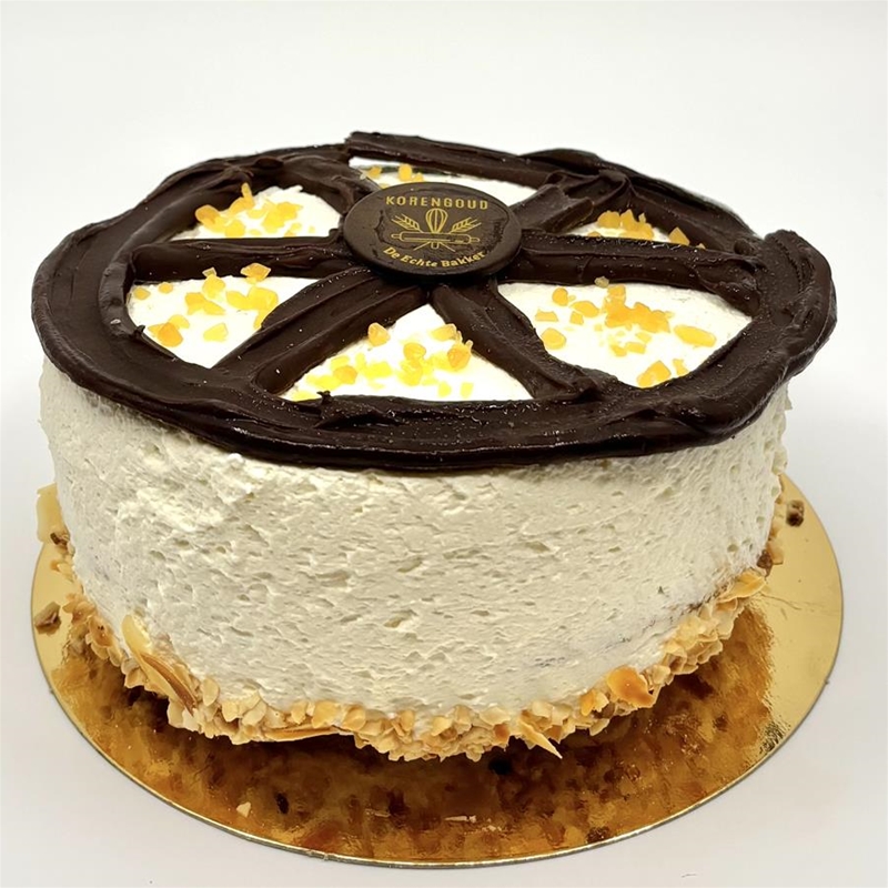 Een ode aan het wiel van Armando bij de Zandverstuiving in Rosmalen. Het taartje is voor 6 personen en bestaat uit knapperig schuim, cake, room, perzik, bitterkoekjes, slagroom en een chocolade wiel.